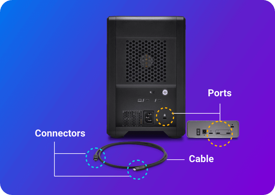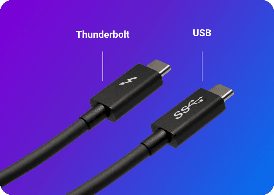 Anschlüsse zur Datenübertragung: Die mobile SSD wird über Anschlüsse, die für die USB- oder Thunderbolt-Protokolle – oder gelegentlich auch für beide – ausgelegt sind, mit dem Hostgerät, z. B. einem Laptop, verbunden.
