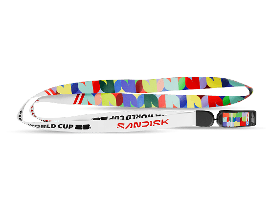 Tragen Sie Ihr pfeifenförmiges USB-Laufwerk mit einem mit Sandisk und FIFA World Cup 2026™ bedruckten Umhängeband, das in jeder Verpackung enthalten ist.