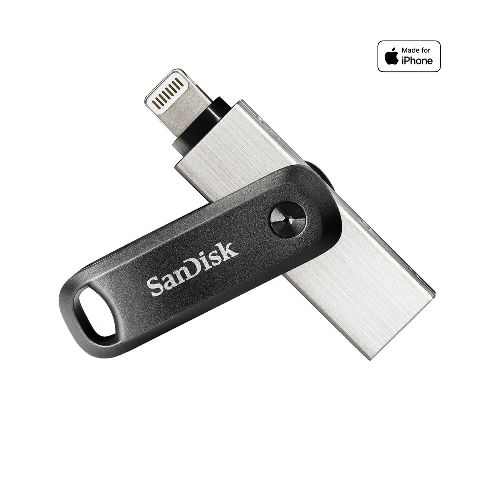 Need more space on your iPhone?1 The iXpand™ Flash Drive Go is the easy way to free up memory. Keep your memories safe by simply plugging in the drive to automatically back up your photos, videos and contacts.2 Once files are on the iXpand Drive, you can use the high-speed USB 3.0 connector to quickly move them onto your computer. You can also password-protect your files, across multiple devices, to keep them private.3 And the dual-purpose swivel protects connectors and features a keyring hole to take your drive on the go.