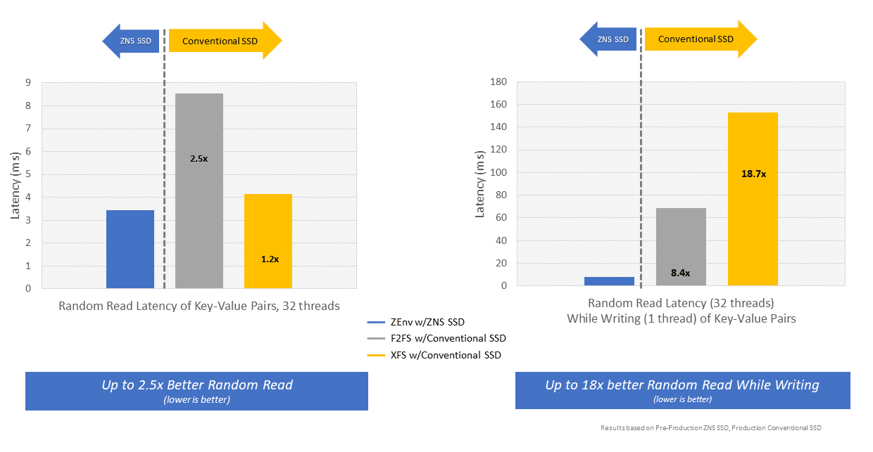 Many of the next-generation “NewSQL” databases leverage the power of RocksDB as their storage engine. Western Digital has created ZenFS, a file system plugin that allows for RocksDB-based applications to directly integrate with ZNS devices. This plugin eliminates background garbage collection on the SSD and file system to leverage the full performance of the underlying flash media.