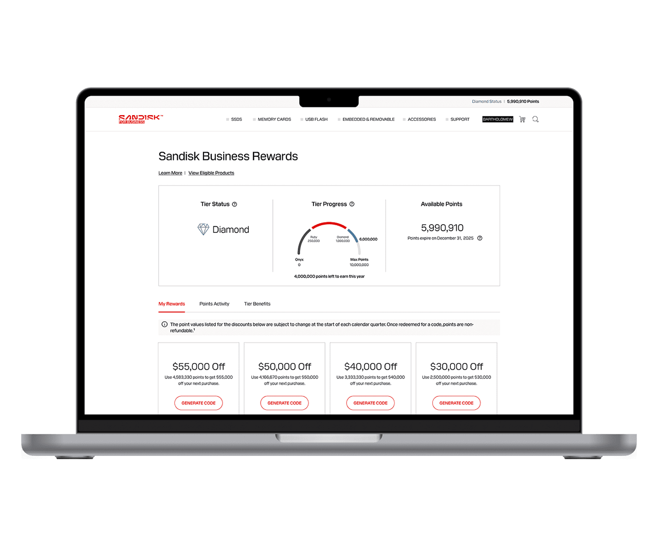 Los clientes aprobados pueden acceder a su cuenta de miembro para consultar los puntos y canjearlos por códigos de descuento. Los códigos de descuento disponibles dependen del saldo de puntos de los clientes. Una vez generados, se pueden aplicar al comprar productos vendidos en la tienda en línea de Sandisk.